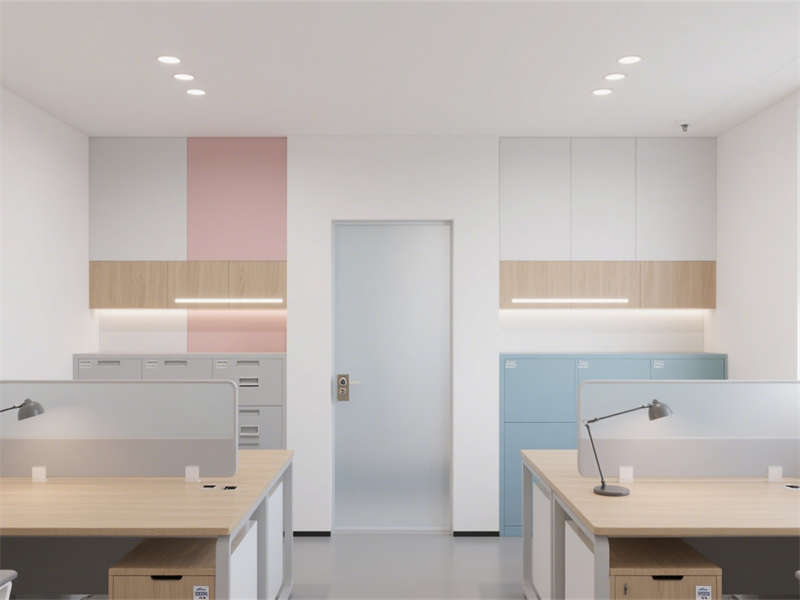 会议室聚焦会议需求,主视觉墙的色彩搭配缓解了会议的紧张感,智能会议屏与充足灯光满足高效沟通。休闲茶水区作为员工放松的“第三空间”,卡座设计节省空间,色彩搭配活跃却不杂乱,为员工提供舒适的休息环境。财务办公室侧重隐私与收纳,磨砂玻璃设计兼顾采光与遮挡,充足的收纳空间满足财务办公的特殊需求。储物间则以实用为主,分区明确,便利的灯光设计提升了使用便捷性,整体保持与其他区域一致的风格,让整个办公室成为一个协调统一的整体。