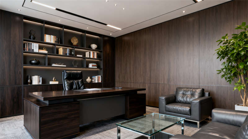 总经理办公室打造独立私密的办公环境,实木家具传递沉稳质感,真皮沙发与茶几构建舒适的接待空间,书架的设置既实用又增添文化氛围。会议室围绕高效沟通需求设计,合理的座椅布局与投影设备搭配,墙面吸音板的运用保障音质清晰。?