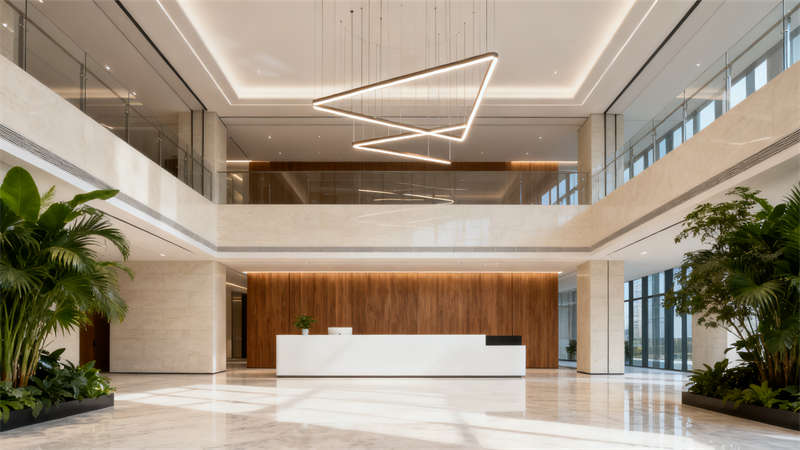 室内空间设计从功能需求出发,大堂采用挑高布局增强开阔感,大理石材质的运用提升空间格调,艺术吊灯与绿植的搭配增添灵动气息,营造出大气且温馨的入口氛围。标准办公区以开放式布局为主,合理的工位隔断兼顾协作与隐私,柔和的条形灯带提供舒适照明,助力高效办公。?