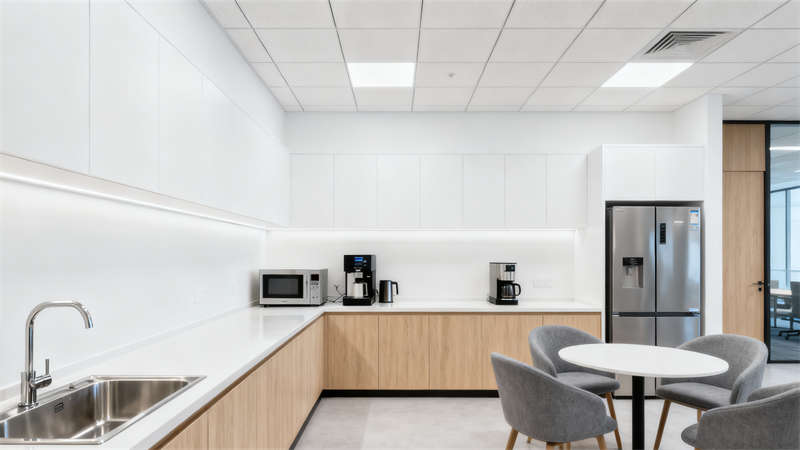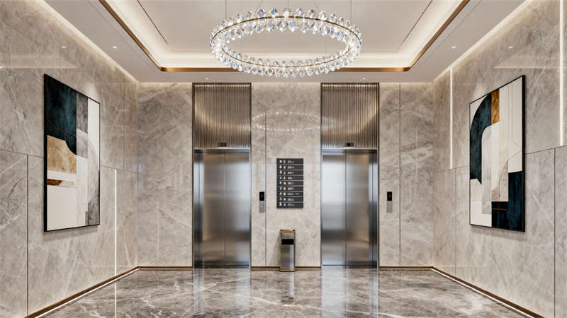 茶水间兼顾实用与休闲属性,齐全的设备满足日常需求,休闲桌椅的设置为员工提供放松空间。电梯厅延续整体简约风格,大理石材质与装饰画、水晶吊灯的搭配,提升空间精致感,指示牌的清晰设置保障通行便捷。