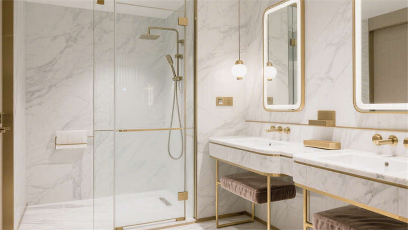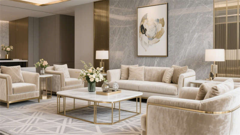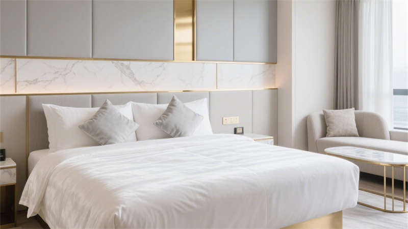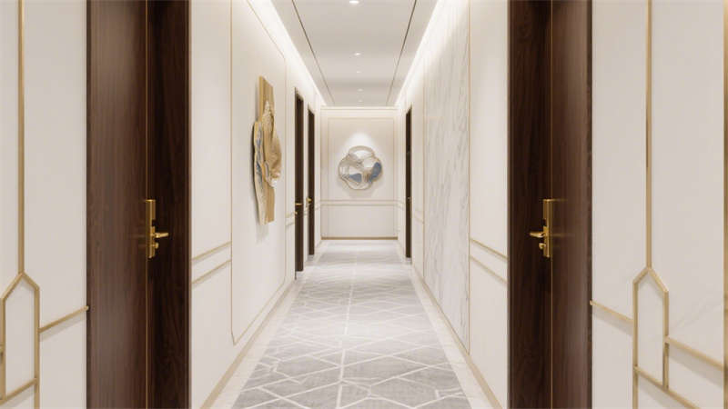 本设计以轻奢风格为核心,通过柔和的基底色调与精致的细节搭配,构建出兼具质感与舒适度的酒店环境。空间以米白色与浅灰色为基础,巧妙融入金色金属线条作为点缀,既避免了过度奢华的厚重感,又增添了空间的精致度。墙面与地面选用细腻的大理石纹理材质,在光线映衬下呈现出自然的光泽,提升整体空间的高级感。家具选型注重线条的简约流畅,搭配柔软的布艺软装,营造出温馨舒适的居住氛围。各个区域在设计上保持风格统一,从公共空间到客房区域,都延续了轻奢的设计语言,让整体空间既富有格调,又能给人带来放松惬意的居住体验。