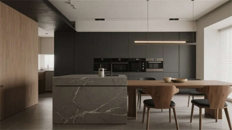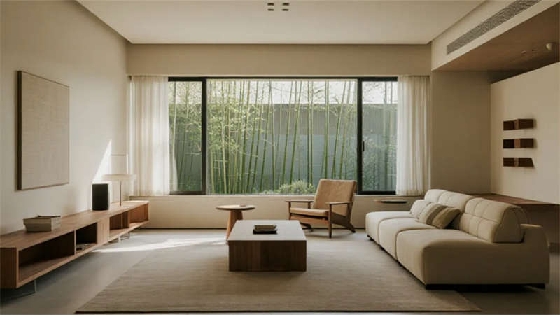 空间布局强调流动性与光影互动,落地窗成为连接内外的画框,将庭院竹影、城市天际线转化为动态艺术装置。无主灯设计搭配隐藏式照明系统,在夜间晕染出柔和的光韵层次。卫浴空间以灰调水磨石营造静谧感,独立浴缸临窗而设,沐浴时可见星月交辉。