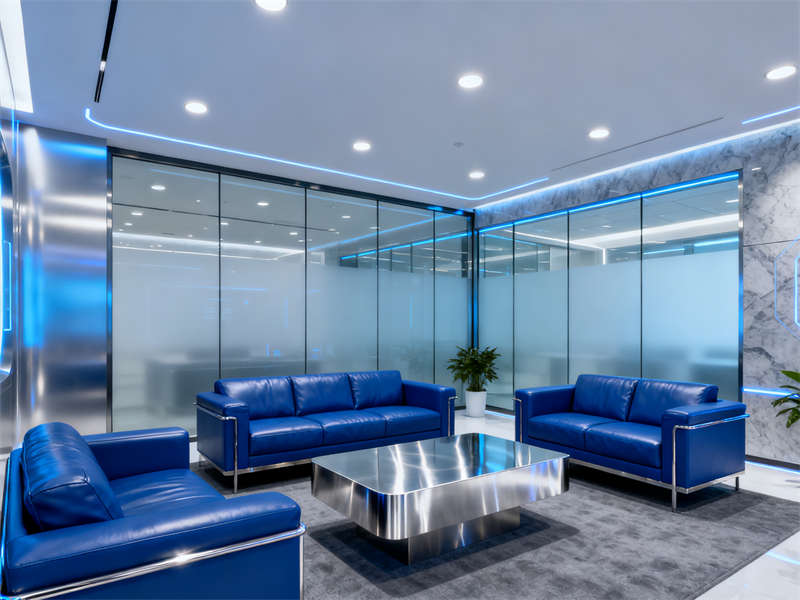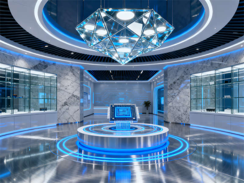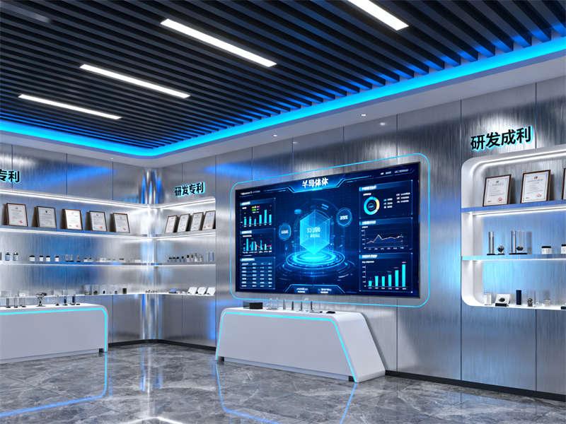 此外,展厅还规划了技术讲解区与洽谈区,两处区域的装修在保持整体风格一致的前提下,通过软装搭配进行区分——技术讲解区配备简洁的多媒体设备与阶梯式座椅,方便开展小型技术分享;洽谈区则以舒适的沙发与矮桌为主,营造出轻松的沟通氛围,整体设计既满足了展示、交流等功能需求,又充分彰显了半导体企业的专业形象与品牌气质。